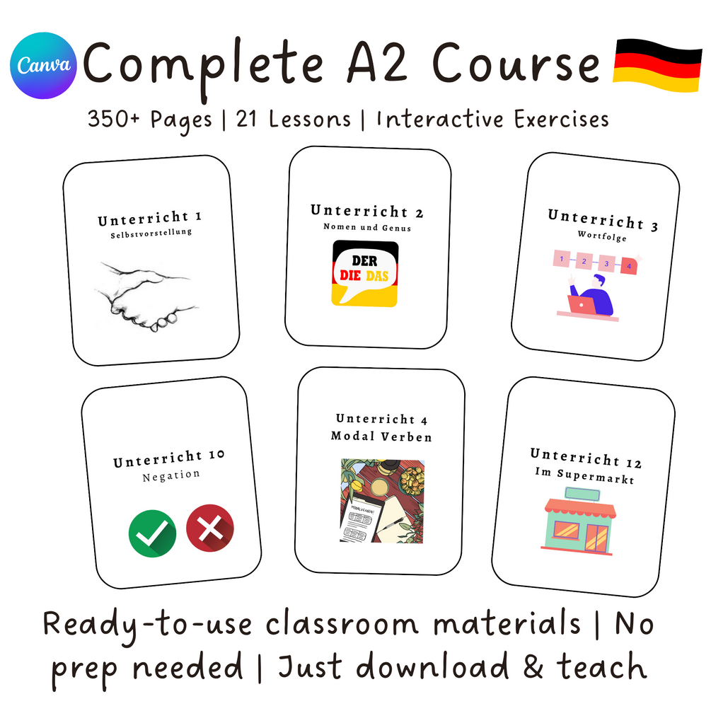 You'll get 20 ready-to-teach A2 lessons (350+ pages) with speaking practice, homework, answer keys, and Quizlet sets — everything you need to run an engaging beginner German course without spending your weekends on prep.